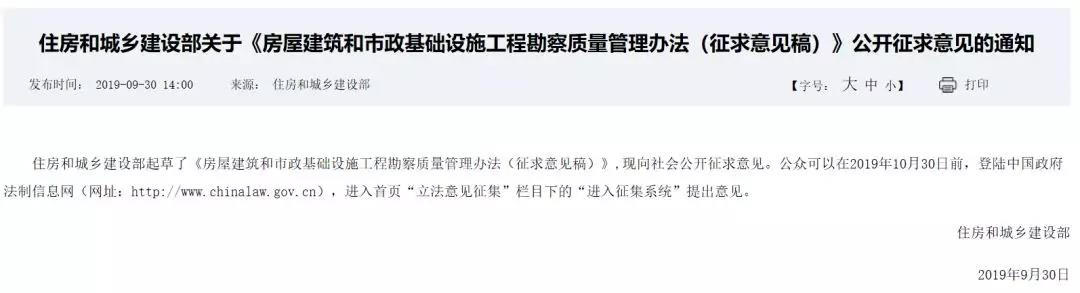 住房和城鄉(xiāng)建設(shè)部起草了《房屋建筑和市政基礎(chǔ)設(shè)施工程勘察質(zhì)量管理辦法(征求意見(jiàn)稿)》,現(xiàn)向社會(huì)公開(kāi)征求意見(jiàn)。公眾可以在2019年10月30日前,登陸中國(guó)政府法制信息網(wǎng)(網(wǎng)址:http://www.chinalaw.gov.cn),進(jìn)入首頁(yè)“立法意見(jiàn)征集”欄目下的“進(jìn)入征集系統(tǒng)”提出意見(jiàn)。住房和城鄉(xiāng)建設(shè)部2019年9月30日《房屋建筑和市政基礎(chǔ)設(shè)施工程勘察質(zhì)量管理辦法(征求意見(jiàn)稿)》第一章 總則第一條 為了加強(qiáng)對(duì)房屋建筑和市政基礎(chǔ)設(shè)施工程勘察質(zhì)量的管理,保證工程勘察質(zhì)量,根據(jù)《中華人民共和國(guó)建筑法》《建設(shè)工程勘察設(shè)計(jì)管理?xiàng)l例》《建設(shè)工程質(zhì)量管理?xiàng)l例》《建設(shè)工程安全生產(chǎn)管理?xiàng)l例》等有關(guān)法律、法規(guī),制定本辦法。第二條 在中華人民共和國(guó)境內(nèi)從事房屋建筑和市政基礎(chǔ)設(shè)施工程(以下簡(jiǎn)稱(chēng)“工程”)勘察活動(dòng)的,應(yīng)遵守本辦法。本辦法所稱(chēng)勘察,是指根據(jù)工程要求,查明、分析、評(píng)價(jià)建設(shè)場(chǎng)地的地質(zhì)、環(huán)境特征和巖土工程條件,并提出合理技術(shù)建議,編制工程勘察文件的活動(dòng)。本辦法所稱(chēng)工程勘察文件,主要包括勘察綱要、勘察報(bào)告等文件。第三條 建設(shè)單位、勘察單位及相關(guān)人員應(yīng)依法對(duì)工程勘察質(zhì)量負(fù)責(zé)。第四條 國(guó)務(wù)院住房和城鄉(xiāng)建設(shè)主管部門(mén)負(fù)責(zé)全國(guó)工程勘察質(zhì)量活動(dòng)的監(jiān)督管理。縣級(jí)以上地方人民政府住房和城鄉(xiāng)建設(shè)主管部門(mén)對(duì)本行政區(qū)域內(nèi)的工程勘察質(zhì)量實(shí)施監(jiān)督管理。第五條 工程勘察行業(yè)相關(guān)社會(huì)團(tuán)體應(yīng)完善行業(yè)約束與懲戒機(jī)制,加強(qiáng)行業(yè)自律,維護(hù)公平競(jìng)爭(zhēng),規(guī)范勘察單位和人員依法從事工程勘察活動(dòng)。第六條 鼓勵(lì)采用先進(jìn)技術(shù)、工藝、設(shè)備、材料和管理方法,提高工程勘察質(zhì)量水平。第二章 責(zé)任和義務(wù)第七條 建設(shè)單位應(yīng)依法與勘察單位簽訂勘察合同,明確勘察任務(wù)要求、工期、費(fèi)用以及各自的質(zhì)量責(zé)任義務(wù)。第八條 建設(shè)單位應(yīng)為勘察工作提供必要的現(xiàn)場(chǎng)工作條件。在勘察工作開(kāi)展前,提供有關(guān)批準(zhǔn)文件,勘察場(chǎng)地地形圖、地下管線(xiàn)及設(shè)施分布圖等與工程勘察有關(guān)的前期資料,并對(duì)資料的真實(shí)性、準(zhǔn)確性、完整性負(fù)責(zé)。第九條 建設(shè)單位應(yīng)加強(qiáng)履約管理,及時(shí)足額支付勘察費(fèi)用。建設(shè)單位可委托具有勘察資質(zhì)的第三方單位提供勘察質(zhì)量管理服務(wù)。建設(shè)單位應(yīng)按規(guī)定將工程勘察文件送施工圖審查機(jī)構(gòu)審查。建設(shè)單位應(yīng)組織勘察單位向設(shè)計(jì)單位、施工單位和監(jiān)理單位進(jìn)行勘察技術(shù)交底。在基坑隱蔽前及時(shí)組織勘察單位、設(shè)計(jì)單位、施工單位、監(jiān)理單位等開(kāi)展施工驗(yàn)槽。第十條 勘察單位必須依法取得工程勘察資質(zhì)證書(shū),并在資質(zhì)等級(jí)許可的范圍內(nèi)承接勘察業(yè)務(wù)。勘察單位應(yīng)按照有關(guān)法律法規(guī)、工程建設(shè)強(qiáng)制性標(biāo)準(zhǔn)、勘察合同及勘察任務(wù)要求開(kāi)展勘察工作,編制工程勘察文件,并對(duì)工程勘察文件的真實(shí)性、準(zhǔn)確性和完整性負(fù)責(zé)。工程勘察文件的編制深度應(yīng)符合國(guó)家規(guī)定的要求。第十一條 勘察單位應(yīng)按照有關(guān)規(guī)定,建立健全勘察質(zhì)量管理制度并確保有效運(yùn)行。第十二條 勘察單位有權(quán)向建設(shè)單位提出保證工程勘察質(zhì)量所必需的現(xiàn)場(chǎng)工作條件、合理技術(shù)要求和合理工期。第十三條 勘察單位應(yīng)在勘探作業(yè)前向作業(yè)人員進(jìn)行交底。勘察單位應(yīng)嚴(yán)格執(zhí)行勘察綱要和勘察操作規(guī)程,采取措施保證各類(lèi)管線(xiàn)、設(shè)施和周邊建筑物、構(gòu)筑物的安全,并做好安全記錄。第十四條 勘察單位應(yīng)按照規(guī)范要求對(duì)試驗(yàn)樣品的取樣、密封、送樣、保管、試驗(yàn)進(jìn)行管理。第十五條 勘察單位應(yīng)保證工程勘察工作原始記錄的真實(shí)和準(zhǔn)確,并應(yīng)在勘察過(guò)程中及時(shí)整理、核對(duì),嚴(yán)禁離開(kāi)現(xiàn)場(chǎng)追記或者補(bǔ)記。項(xiàng)目負(fù)責(zé)人或其授權(quán)人員應(yīng)及時(shí)對(duì)原始記錄進(jìn)行驗(yàn)收簽字。鼓勵(lì)勘察單位采用信息化手段,實(shí)時(shí)采集、記錄、存儲(chǔ)工程勘察數(shù)據(jù)。鼓勵(lì)勘察單位采用影像等方式對(duì)鉆探、取樣、原位測(cè)試、室內(nèi)試驗(yàn)等主要過(guò)程進(jìn)行記錄。勘察單位在原始記錄中不得存在下列情形:(一)紙質(zhì)原始記錄與電子存儲(chǔ)記錄不一致的;(二)試驗(yàn)、測(cè)試報(bào)告與試驗(yàn)、測(cè)試的過(guò)程記錄